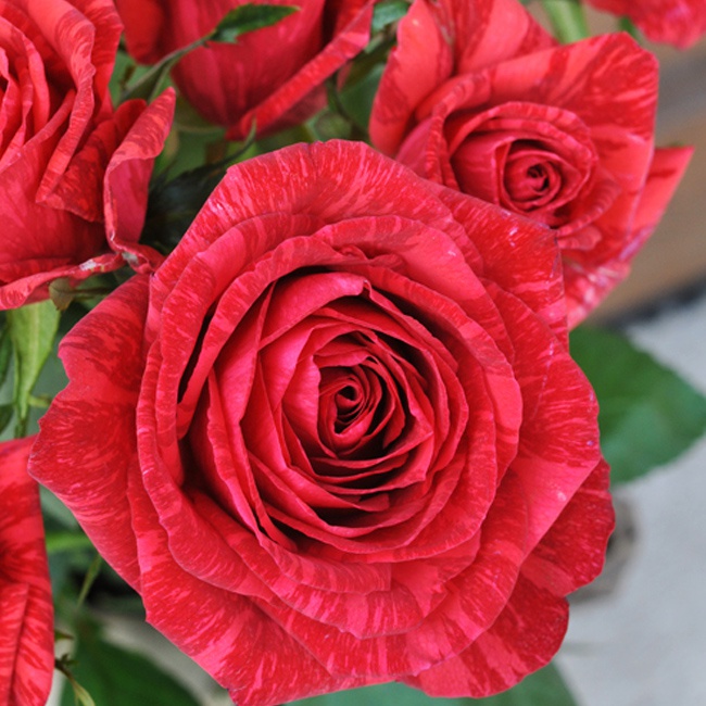ハイブリッド・ティーローズ系のバラは四季咲き、大輪系。一茎に一輪咲かせて花の見事さを楽しみます。