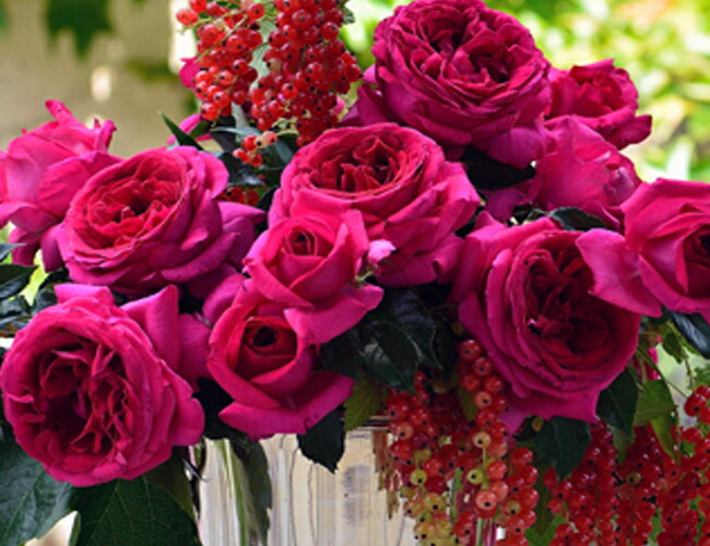 明るさと深みを併せ持った大人雰囲気の赤色品種です。丸弁高芯咲きのハイブリッドティーのような蕾から、開くとロゼット咲きになります。濃い緑の照り葉が健康的で、耐病性も強い品種です。樹は中程度のブッシュタイプです。うどん粉病に強く、花もちも良い。樹勢も強く生育も旺盛で、横に広がらない樹形でボリュームがある株に育ちます。初心者の方でも育てやすい品種ではないでしょうか。1番花よりも2番花のほうがちょうどよい大きさで咲きます。