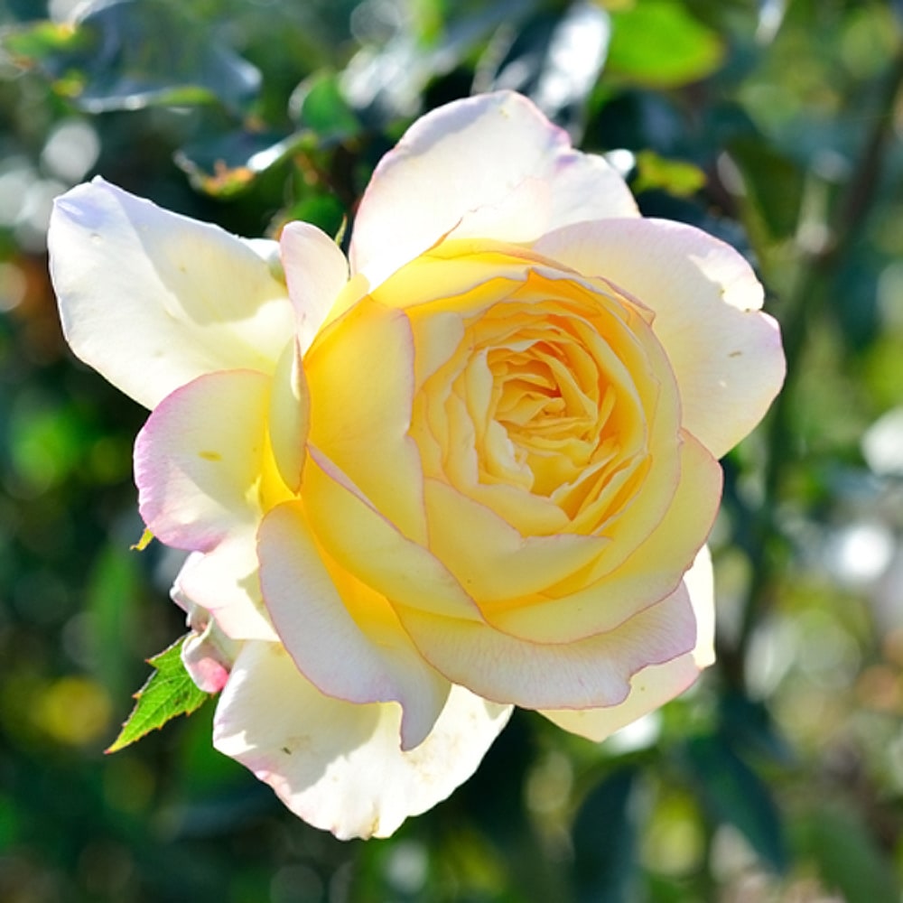 ややフリルがかった重ねの多い花弁で、淡い黄色から白のグラデーションが入り、さらに縁にはピンクの覆輪が入ります。季節によって花色が変化していくのも楽しみです。