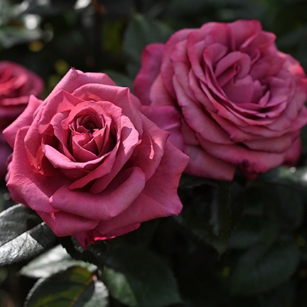 ヴィウー・ローズはコンパクトなハイブリットティー、半直立性。ニュアンスのあるシックな赤紫で高芯咲きで、花が咲き進むと最終的にはロゼットっぽくなって花いろがくすんでいきます。濃いピンクな赤ピンクから、次第に花いろがくすんで、渋めの花色になります。くすみの感じがシックで綺麗。大輪で強い香り、花もちも良い。