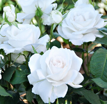 エレガントな花型、透き通るようなシルキーホワイトの大輪花。凛としてさわやかな香りです。非常に四季咲き性が強く繰り返しよく咲きます。コンパクトなハイブリッドティーですが、房咲きになることが多いグランディフローラ。中型のブッシュタイプで庭でも鉢でも育てやすいです。耐病性は中程度。薬剤散布すれば良く育知ます。