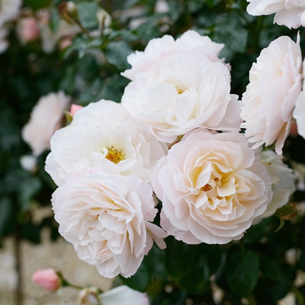 シフォナードはやや波打つ花弁がやさしく重なる中輪花で、5輪前後の房咲きになります。クリームピンクからクリームイエローに変化しながら開花するので、花房全体として淡いグラデーションがとても美しい品種です。樹形は小型のシュラブでまとまりよく、耐病性も強いので育てやすいので初心者にもおすすめです。