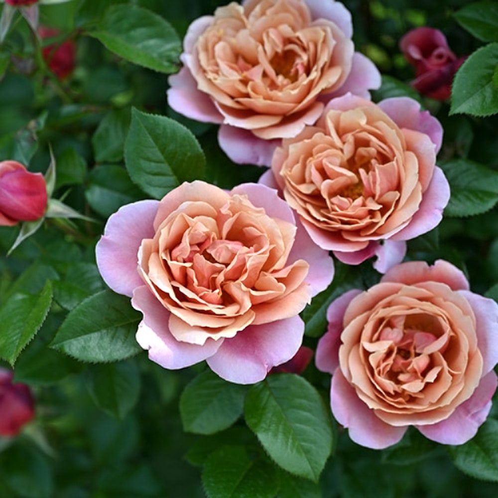 シュラブローズはブッシュローズ(木立バラ)とクライミングローズ(つるバラ)の中間的な樹形で、やや高性になるものや半つる性になるものです。鉢植えや花壇、オベリスクなど使い勝手が良いので、用途やシーンを選ばずに用いやすい品種が多いです。