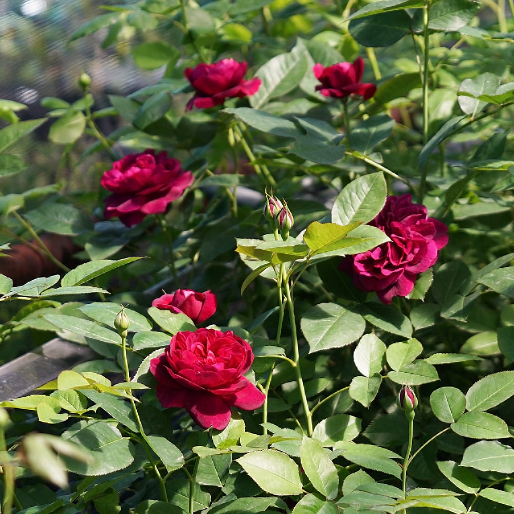 育種が難しいと言われてる発色の良い赤バラの中でも「ダーシー・バッセル」は最も病気になりにくいベストな品種のひとつとされています。黒星病に強い。花自体はそれほど大きくありませんが、連続開花性は素晴らしいものがあります。咲き始めの花の外弁は完全にリング状になっており、咲き進むごとに見事なロゼットになってゆきます。花弁数は70枚くらいで花色は深いリッチ・クリムソンから、花が終わる時には藤色に染まってゆきます。心地よいフルーティーな香りです。