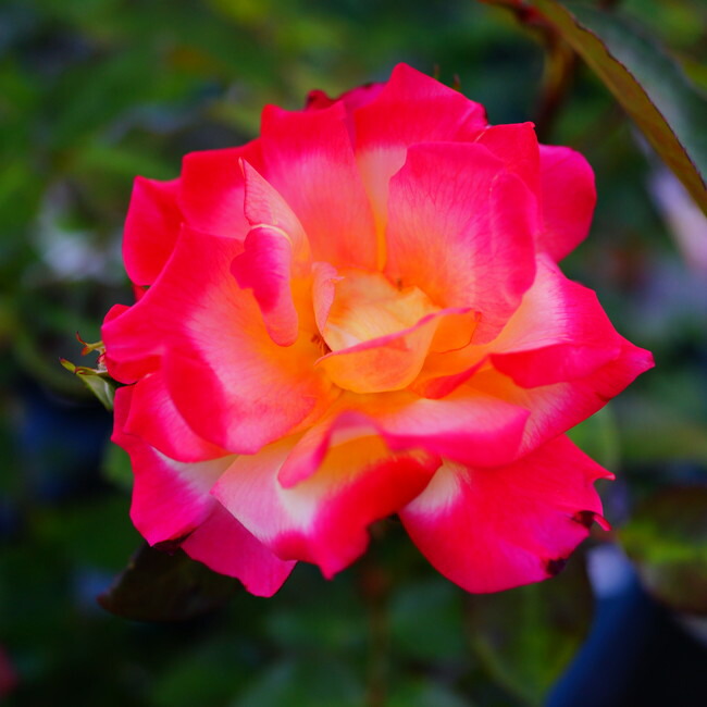咲き始めは黄色で、次第に赤く変化する花色です。黄色と赤の覆輪、その後朱赤のバラに変化します、まるで3色が咲き乱れるようなバラです。1株で3色乱れ咲くのがうれしいですね。楽しみが3倍という感じで欲張りな品種です。数輪が大きな房咲きになって咲き、華やかです。花つき、花もちが良く、株全体を花が覆います。枝は赤実がかり、葉は濃い緑葉で存在感があります。早咲きで春の初めから咲き始めます。