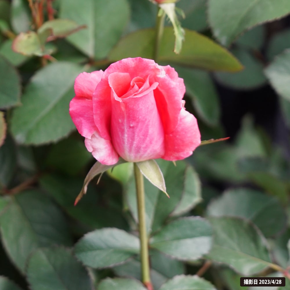 ハイブリッド・ティーローズ系のバラは四季咲き、大輪系。一茎に一輪咲かせて花の見事さを楽しみます。