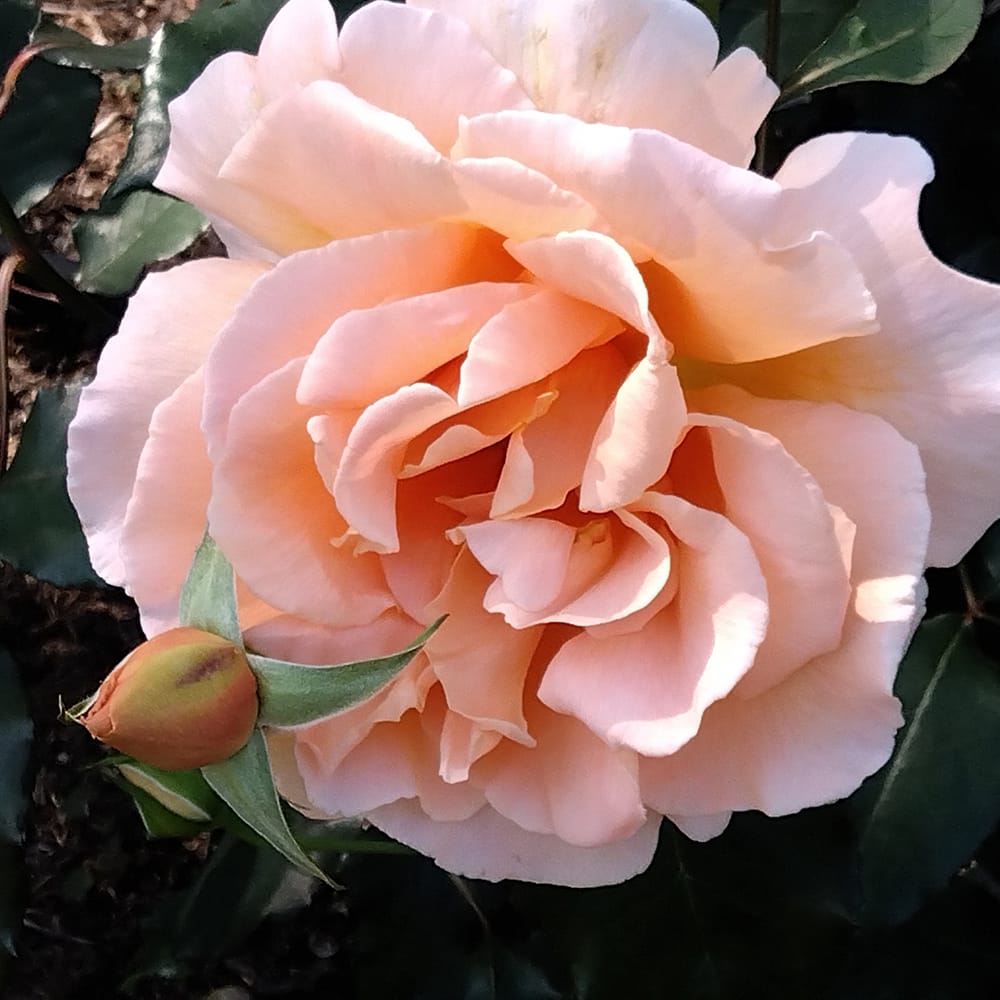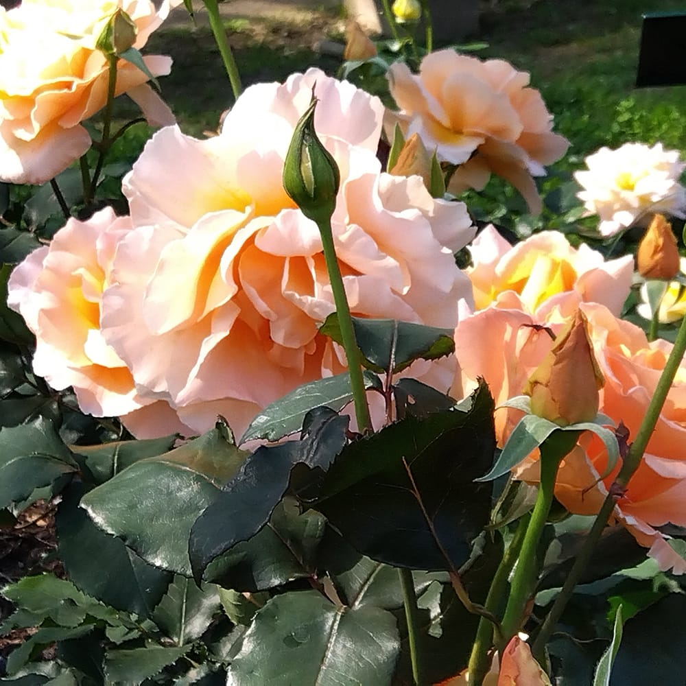 ジャストジョーイはインパクトの強い巨大輪です。輝くばかりに美しいアプリコット色の半剣弁高芯咲き。弁先が少し波立ち、かわいらしい雰囲気です。早咲きで香りも強く、秋は花色が濃くなります。花付きも花もちも比較的良い方です。