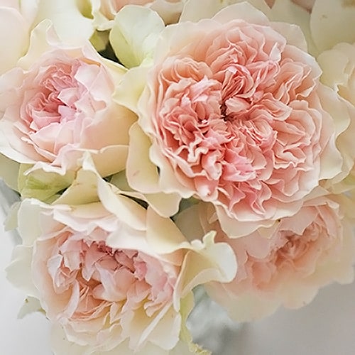 「クロッシェ」は、外側が緑がかった白に近いピンクになる薔薇です。波打つタイプのロゼット咲き、中輪ですが繊細な花弁の花形が今までにない美しさを出しています。咲き始めは外弁の透明感あるふんわりとした花びらにグリーンがかかり、開くとロゼットになって中心がピンクに染まります。レース編みしたように細かく花びらが重なり合う。ティとミルラの中香も珍しく、追加で植えたい薔薇の一つです。花もちも良い。