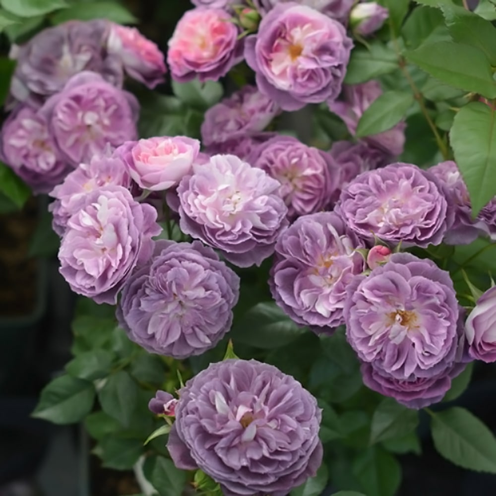 「リナルド」は、咲き始めは魅力的な濃い紫、咲き進むにつれピンクを含んだ赤紫色となり最後にはシックな紫色へと変化します。房咲の小花が魅力的です。季節によっても花色が変化するため、一年を通じて多様な姿が楽しめます。秋は彩度が落ちたグレートーンで咲きます。あまり広がらない樹形なので扱いやすいバラ。