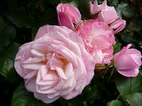 可憐なピンク色の小花が次々咲くつるバラです。やさしい日本的な花です。花弁数:15枚位で半剣弁平咲きです。 |