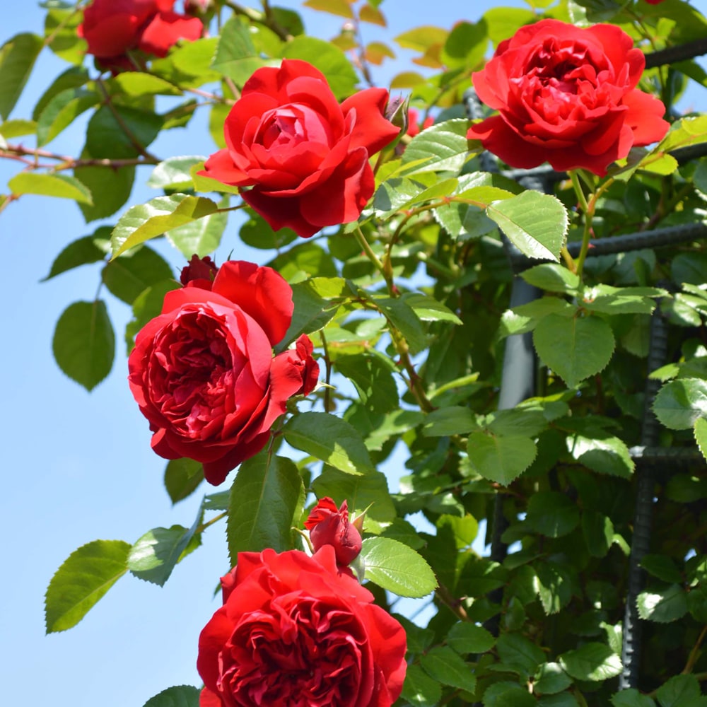女性の名前から取られた「フロレンティーナ」は鮮やかな赤が目を奪うとても華やかな房咲きのバラです。ティーのほのかな香りで、繰り返しよく咲くうえ、花もちもよいです。