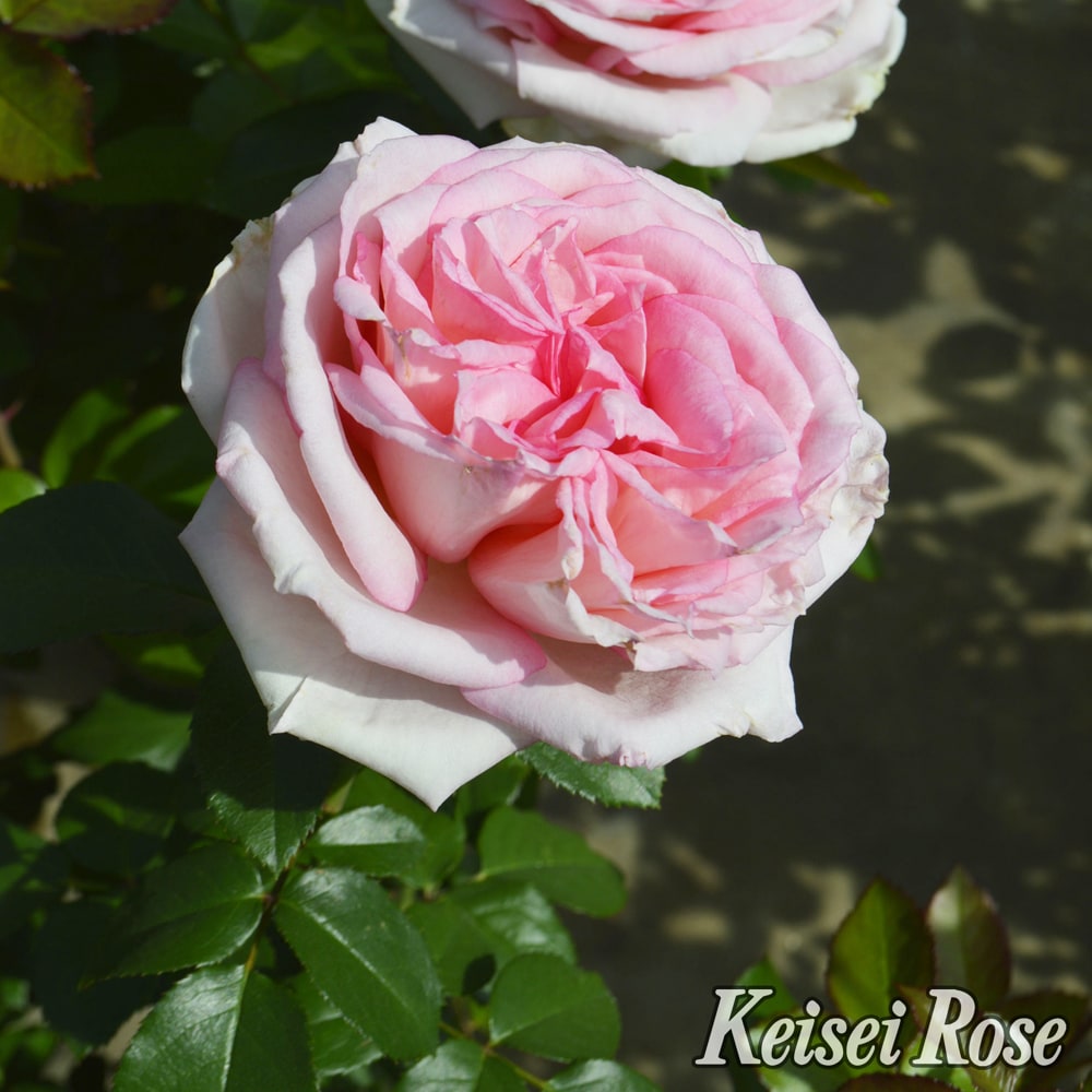 マカロンのように丸い大輪花のつるバラです。やわらかい色合いの花は、気候により中心がやや濃いピンク色にもなります。丈夫なきれいな葉色とのコントラストも魅力です。甘い香りも楽しめます。