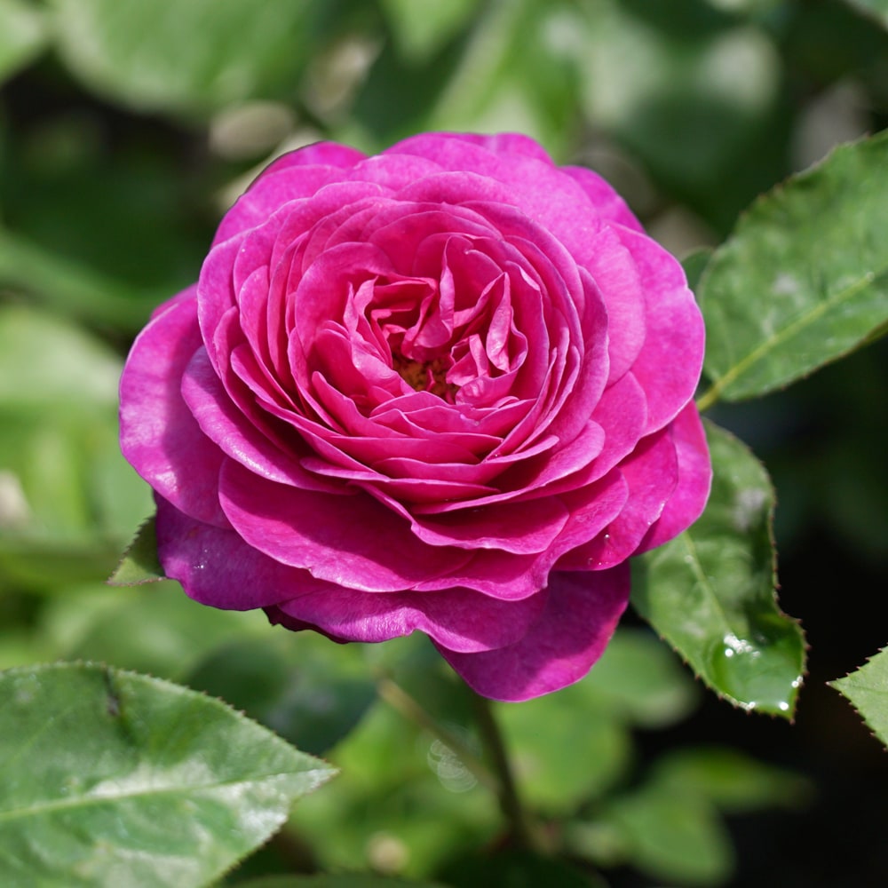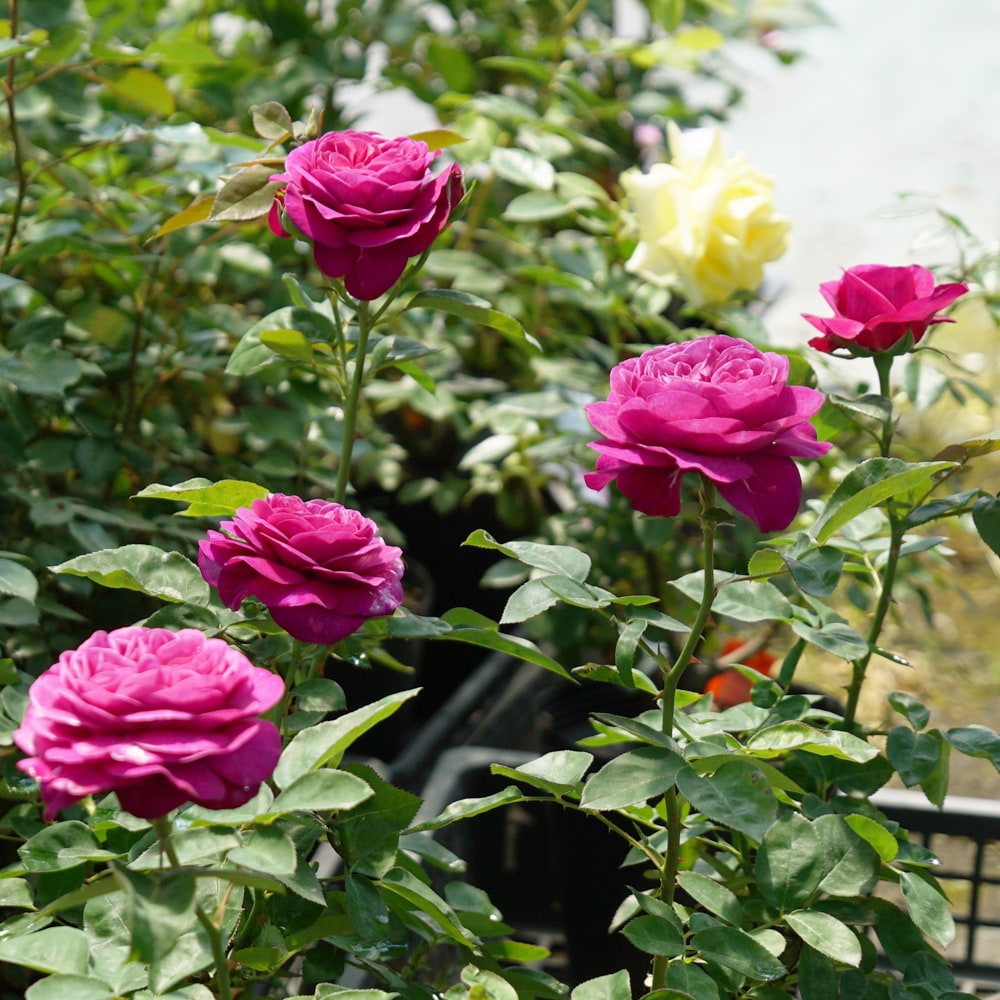 ヴァイオレットピンクの花色と丸弁ロゼット咲の花形に、ダマッセナ系の強香を兼ねそなえたシックなバラです。花弁数は90枚くらい。花付き、花もちともに優秀です。コンパクトに育つので鉢植えにおすすめです。耐寒性が強いので、夏に涼しい地域におすすめ。耐病性に欠けるので定期的な薬剤散布が必要。