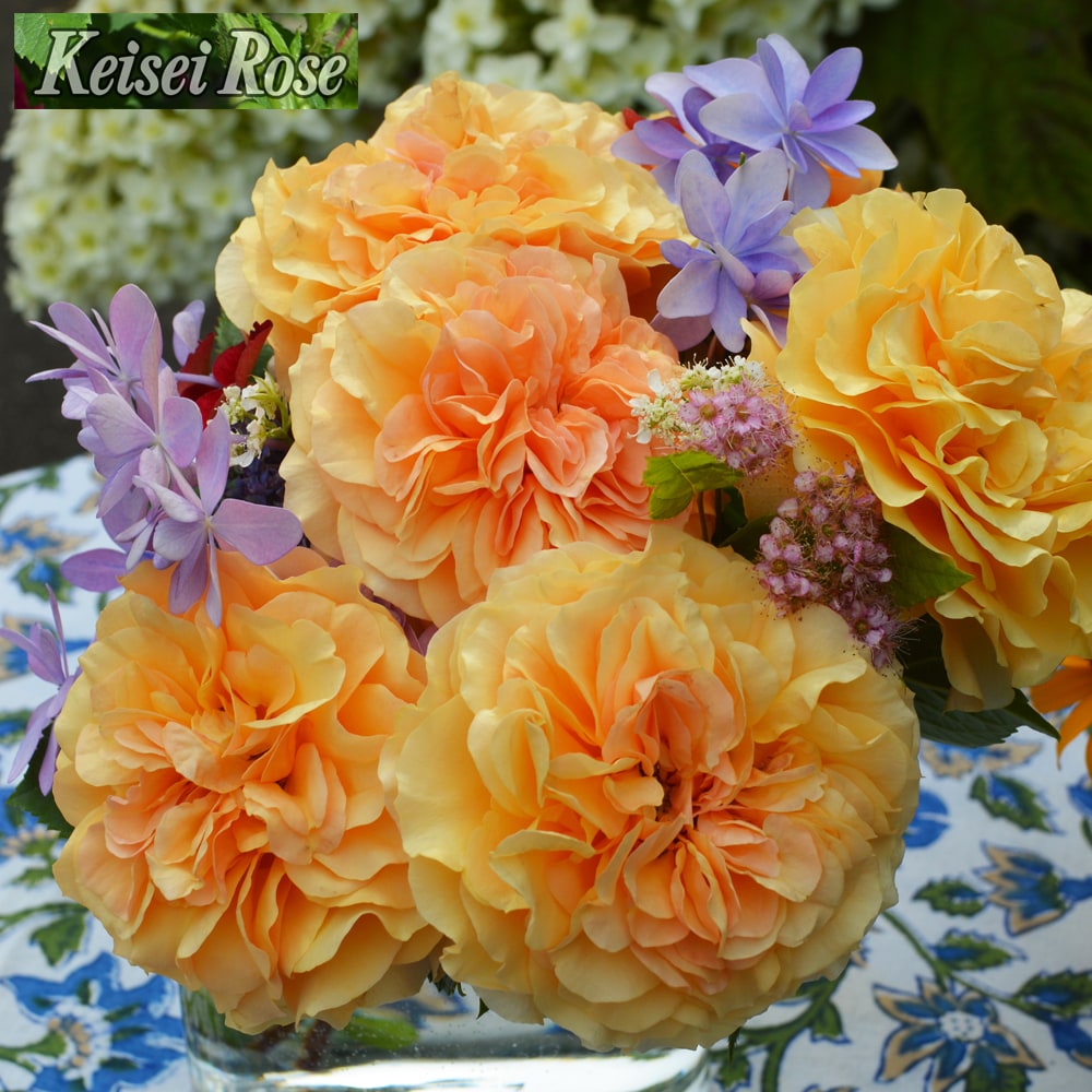 「カントリートレンドセッター」は花弁が多い華やかなオレンジの花が房状に咲く華やかなバラです。花弁が強くステムも長いため切花向き。黒星病が若干つきますが、木が弱ることは少ないので比較的育てやすい品種です。直立で株のまとまりもいいので植栽にも向いています。
