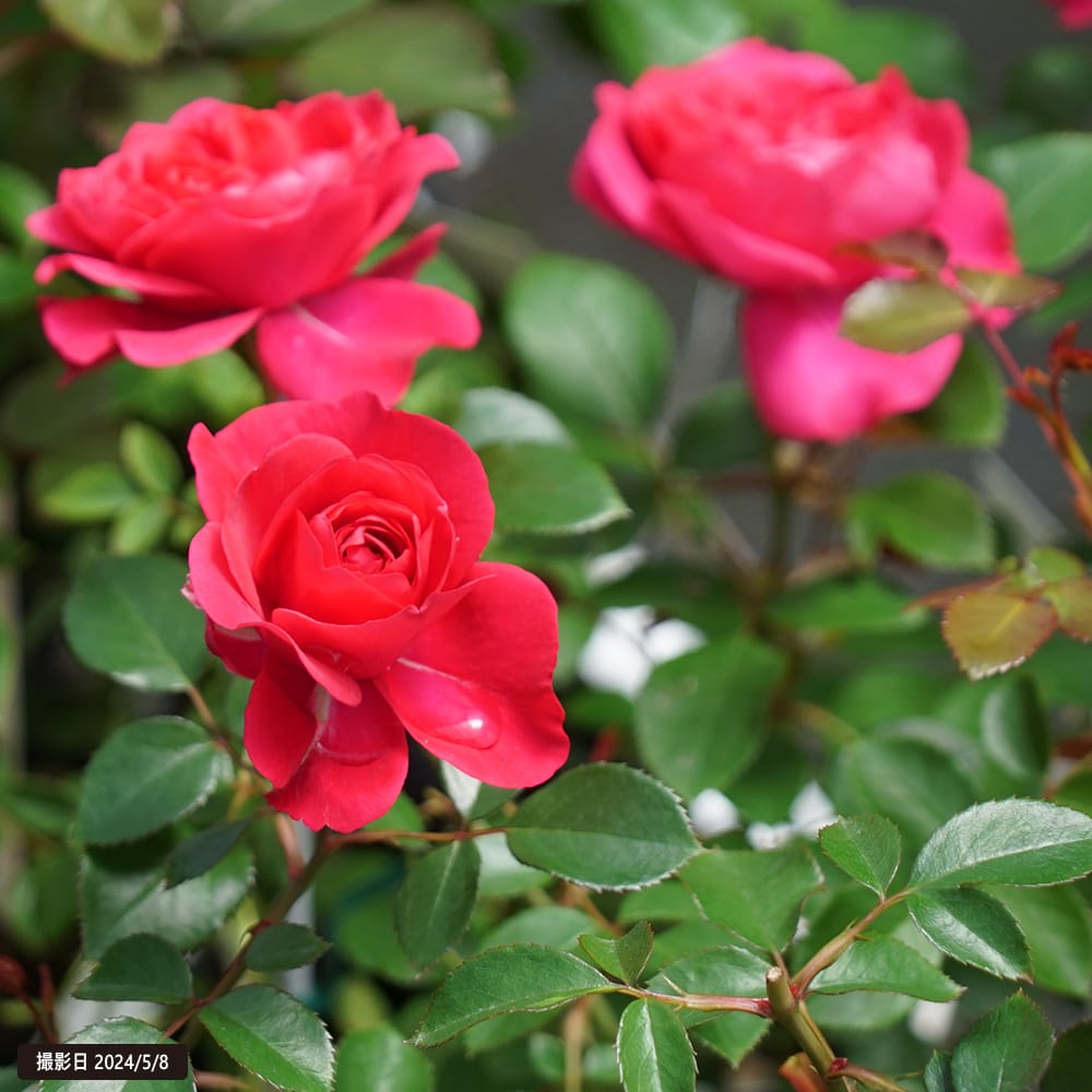 「紅かさね」はコンパクトで花つきが良い品種。着物の重ねのように鮮やかなローズレッドの花弁が幾重にも重なることからそう名付けられました。背丈が低いので草花との相性が良く、耐病性があるので丈夫で育てやすい品種です。寒さには少し弱いので、寒冷地では深植えにして株もとの枝を枯らさないようにします。