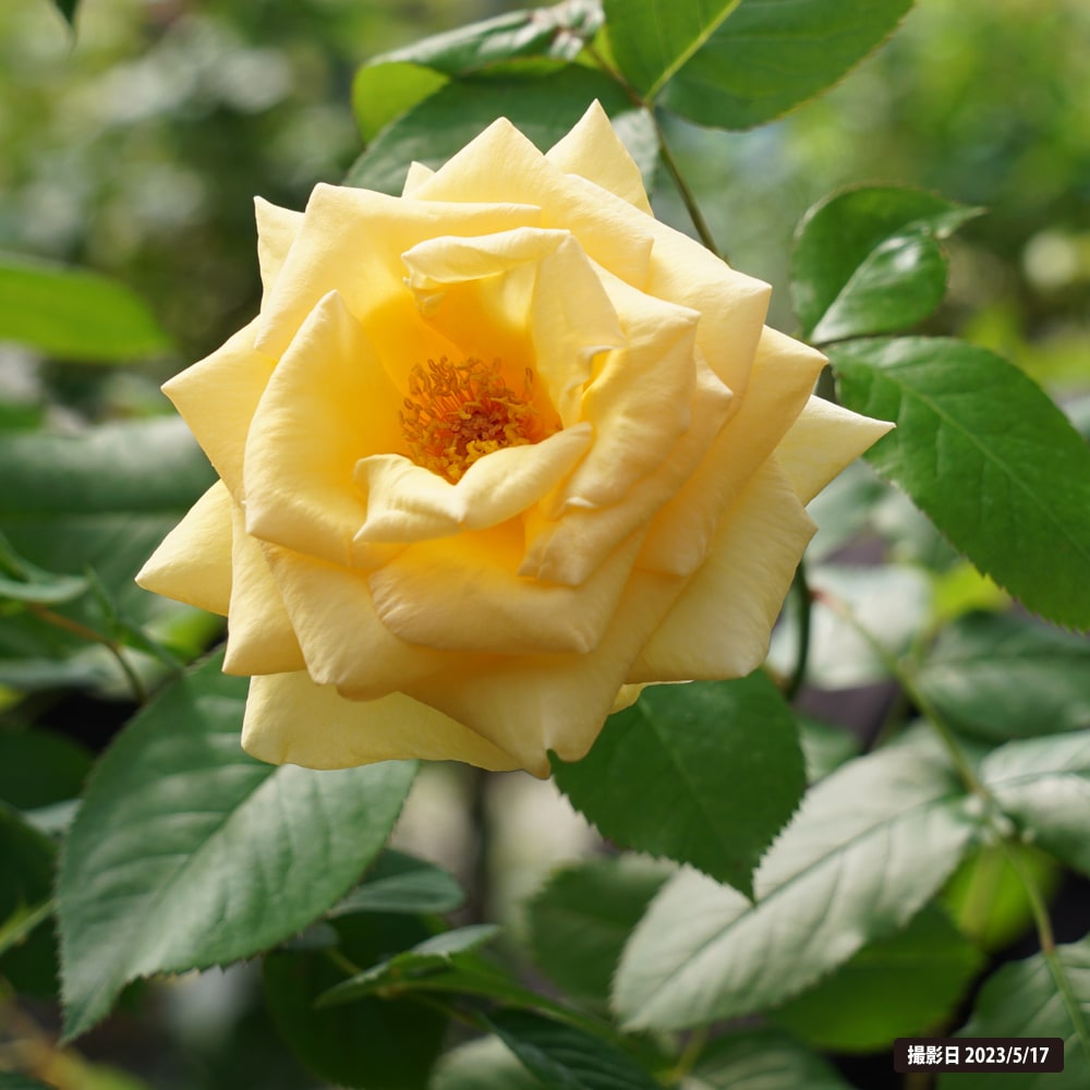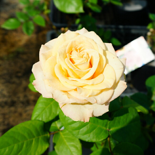ふちに近づくにつれ、やわらかなクリーム色に変化していくライトイエローの花は、見る者の心を温めてくれる独特の色彩です。丸弁平咲きの大輪花が、ふっくらとおおらかに開花する様子も、男性の深い包容力を感じさせるようです。花付きが良く花もちが良い、黒星病に強い稀少な黄色系品種で、樹勢も良く、育てやすいバラです。うどん粉病に強い。