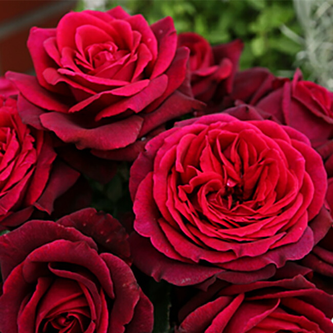 ディープな赤紫色からビビッドなレッドに徐々に花色が変化していきます。花弁は厚みのある半剣弁咲きで、花もちが良い品種です。うどん粉病、黒星病にとても強く丈夫です。モダン・ダマスク系にレモンやライチなどのフルーティ感が調和した洗練された香りのハイブリッドティーローズです。