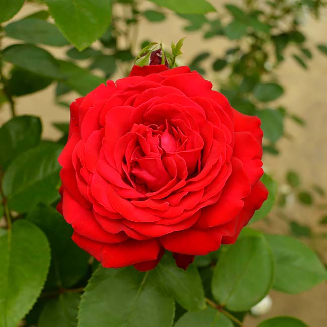 丈夫な赤の大輪花。丸弁平咲きの花は房咲きになる場合もあります。花もちもよいです。葉は病気に強い照り葉です。うどん粉病に強い。黒星病に強い。花弁が強く、花もちが良いです。
