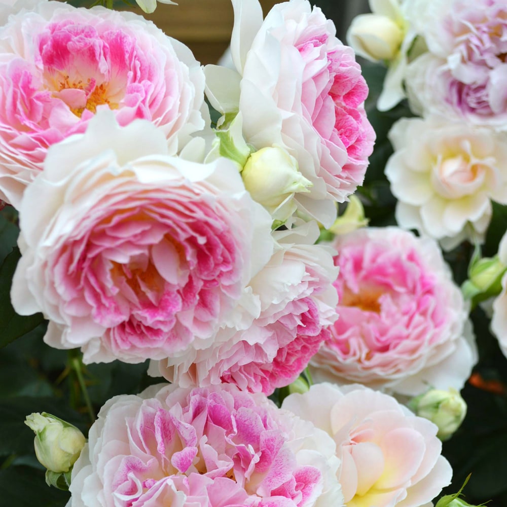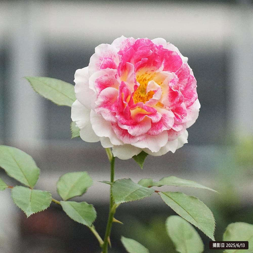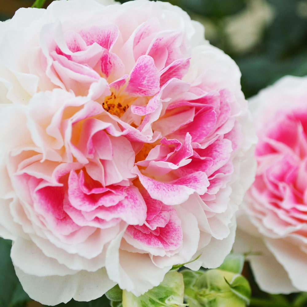 白地にローズピンクが絵の具を吹き付けた模様のようにのり、シャクヤクのような華やかさの中にも可愛らしい雰囲気を持つバラです。