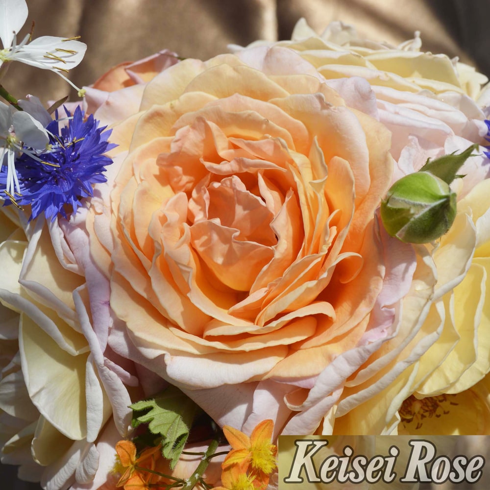 ハイブリッド・ティーローズ系のバラは四季咲き、大輪系。一茎に一輪咲かせて花の見事さを楽しみます。