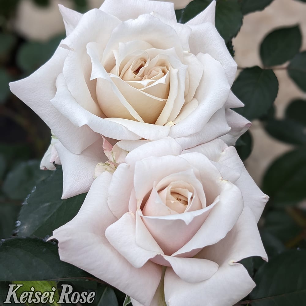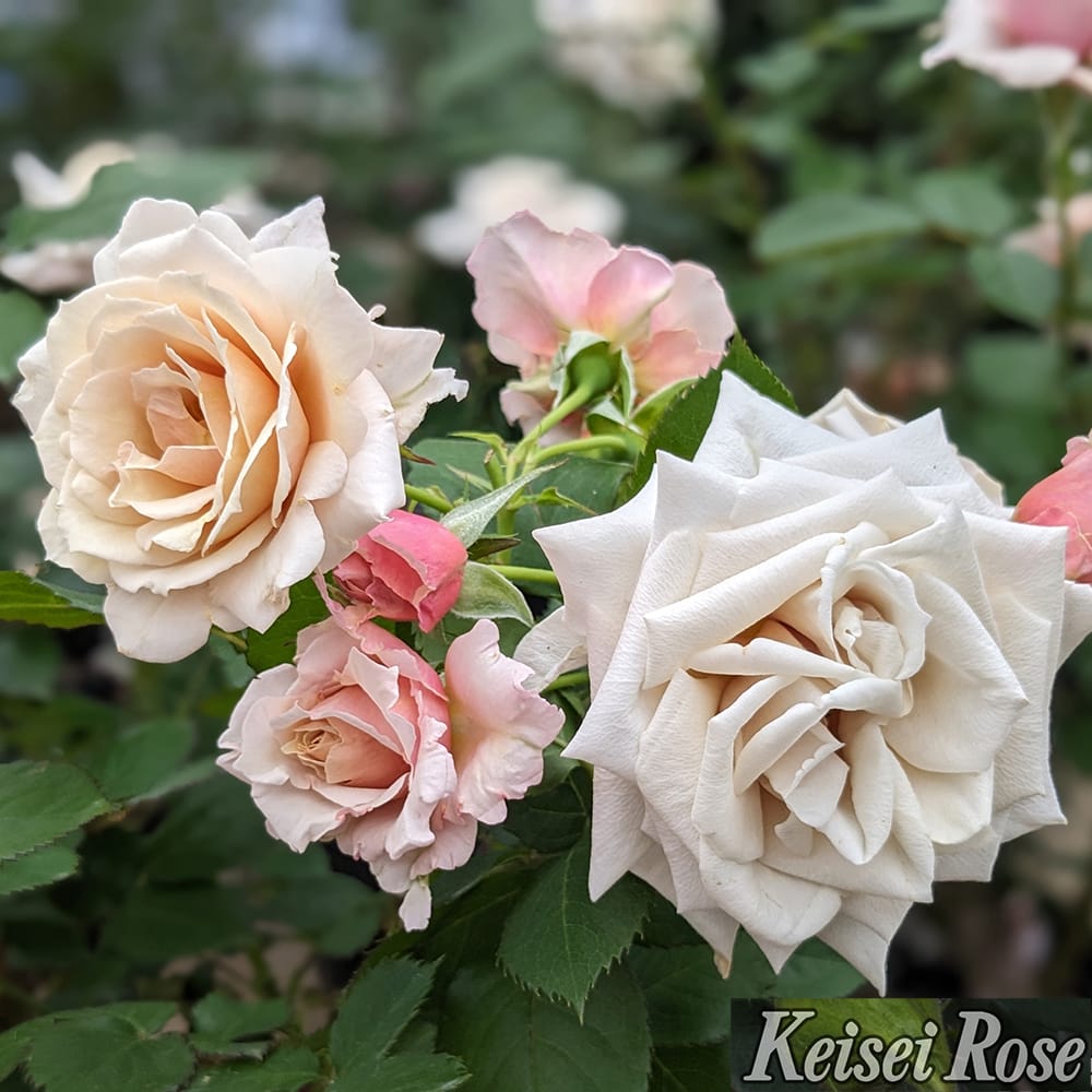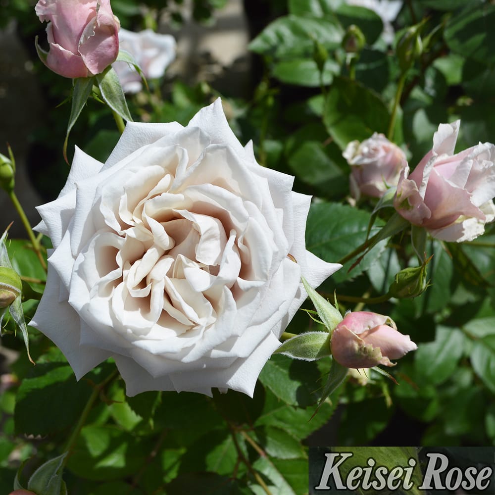 「希成」はニュアンスカラーの大輪の花が楽しめるバラです。剣弁高芯咲の花がロゼットに変化する様子が目を引きます。樹勢はあまり強くないため、消毒等でしっかり防除し、葉をきっちり残せるよう管理することで秋バラも楽しめます。希望の「希」と生成の「成」を組み合わせて名づけられました。