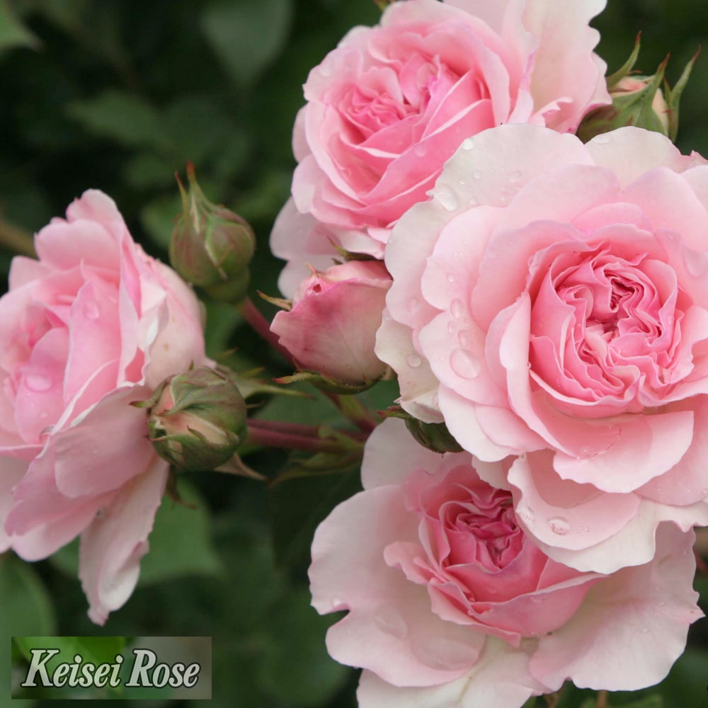 花の中心部まで花弁が柔らかくウェーブし、一房に4,5個花を付ける房咲き品種。柔らかなピンクの花弁の中心部が濃いコーラルピンク色になり、美しさが映えます。花もちも良いです。光沢のある葉も素晴らしい!うどんこ病に強く、黒星病に強い。寒さに強く、病害虫に強く生育良好な強健種!初心者にもおすすめです。