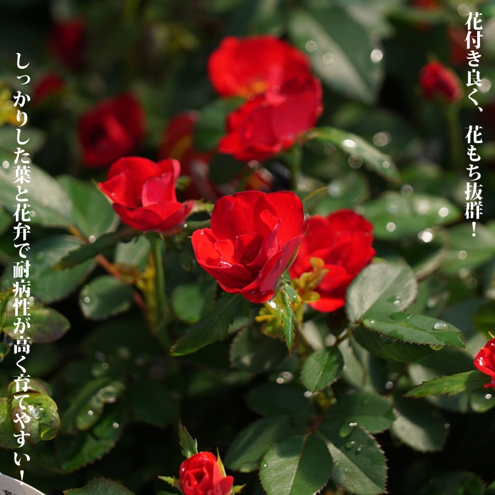 分枝が良く、適時ピンチすることによって花数が増え、ピンチから約30日後には花芽が付きます。繰り返し楽しむことができるうえ、花弁が厚い花は20日ほど咲き続けます。4月から10月までの間は、まるで一年草のようにたくさん花が咲く嬉しい品種。わい性種のため小さな鉢での栽培も可能ですし、コンパクトな草姿は寄せ植えにも適してます。また、他のバラよりも低日照下でも花芽が付きやすいので、室内の窓辺でも楽しめます。