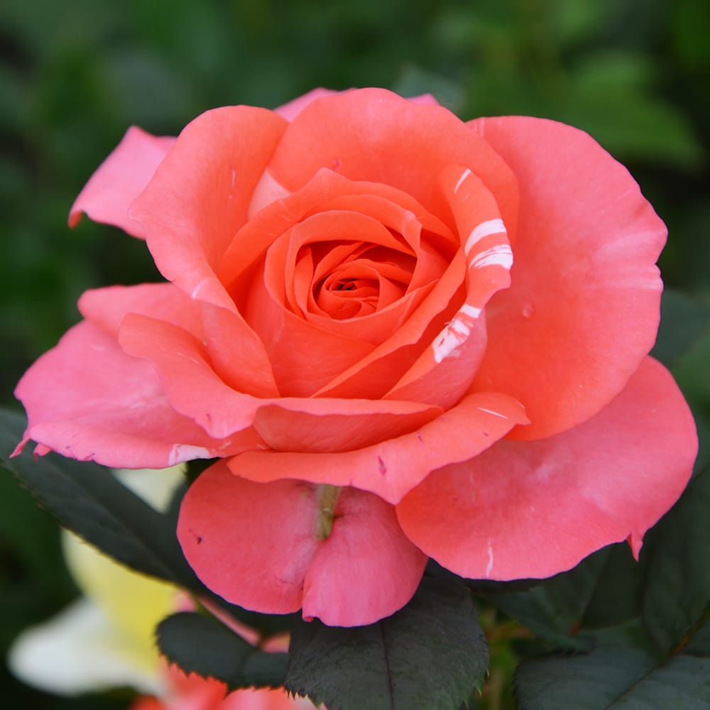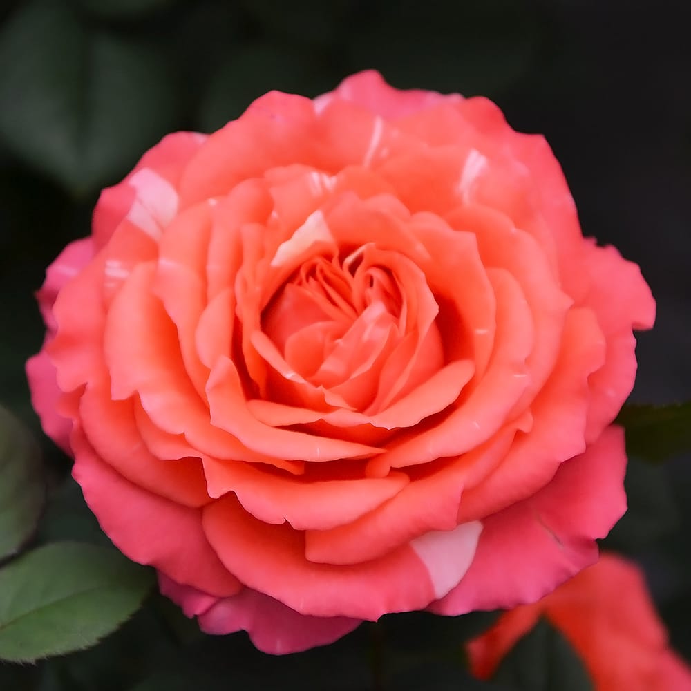 若々しく美しいという意味を持つ「クロエ」は濃いオレンジの花弁に気まぐれな白の絞りが入る印象的なバラです。剣弁高芯咲きのバラらしいバラ。巻きが多いのも特徴です。コンパクトな樹形に収まるので、鉢植えでも地植えでも楽しめます。枝立ちも良くたくさん花をつけフルーティーな優しい香も魅力です。
