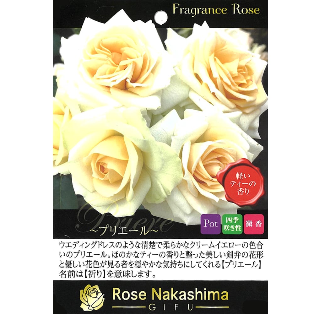 祈りを意味する「プリエール」は、清楚で柔らかなクリームイエロー花弁もつ美しい中輪バラ。高さ60cm程のコンパクトな木立性で、鉢植えでも地植えでも育てやすい品種です。暑さに強く他のバラが開花を休む盛夏にもしっかりと咲き続ける強健さを持つ特別なバラです。ほのかなティーの香りと整った美しい剣弁の花形とやさしい花色が見る者を穏やかな気持ちにしてくれます。