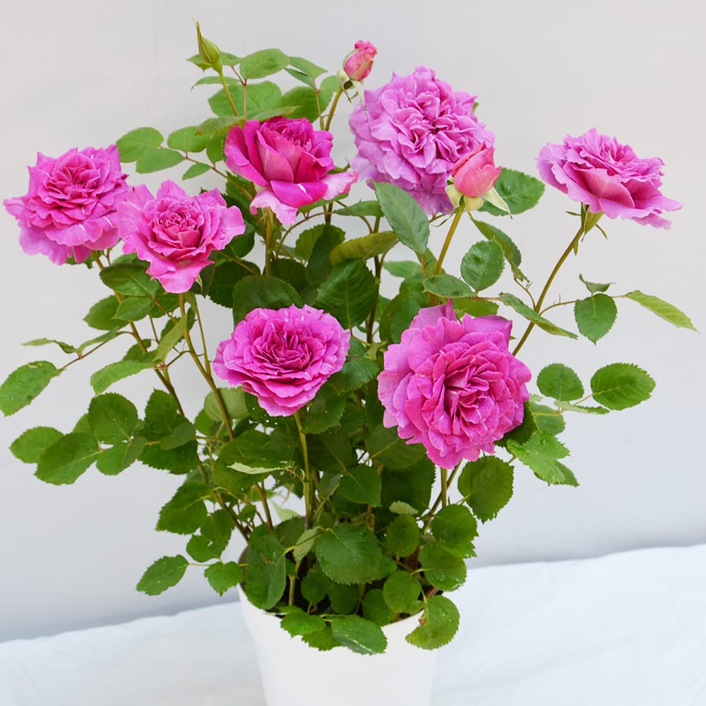 女王を意味する「レジーナ」は鮮やかなマゼンタ色にホワイトのラインが入る花弁が特徴的なバラです。甘いダマスク系の強香が楽しめます。高さ70cm程のコンパクトな木立性です。鉢植え栽培でも地植えでも楽しめます。