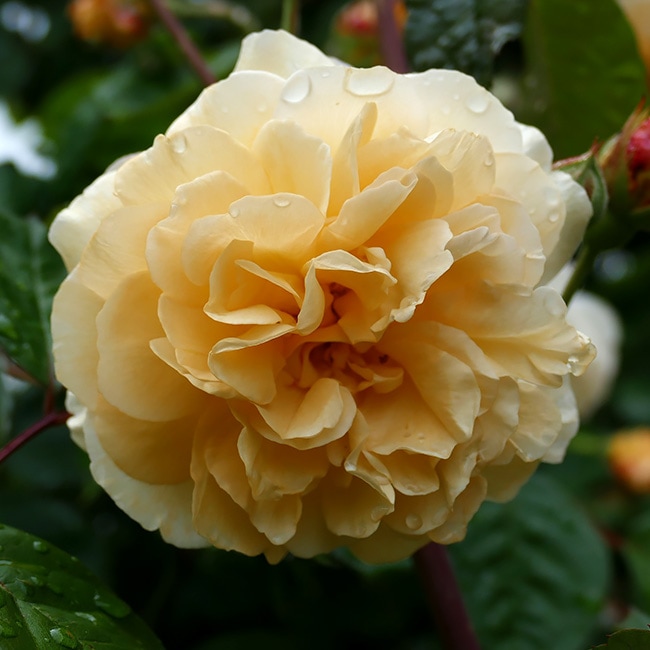 独特の花色でバラ愛好家から愛される品種。ややピンクがかったアンズ色の半八重のロゼット咲き。くすんだオレンジ色と甘いムスクとティーローズの香りが人気。秋の花色はいっそうさえて美しい。