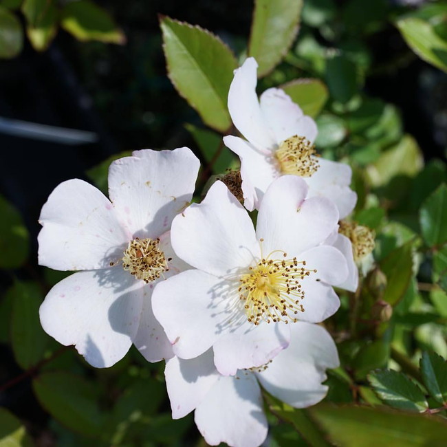 花弁の外側がピンク、内側が白で黄色のしべが可愛い一重咲きのバラです。やや遅咲きかな。枝がよく伸びしなり、ランブラーローズのように育ちます。一季咲きのつるバラなので、春に豪快に咲かせたい品種ですね。
