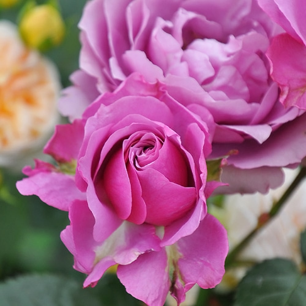 シュラブローズはブッシュローズ(木立バラ)とクライミングローズ(つるバラ)の中間的な樹形で、やや高性になるものや半つる性になるものです。鉢植えや花壇、オベリスクなど使い勝手が良いので、用途やシーンを選ばずに用いやすい品種が多いです。