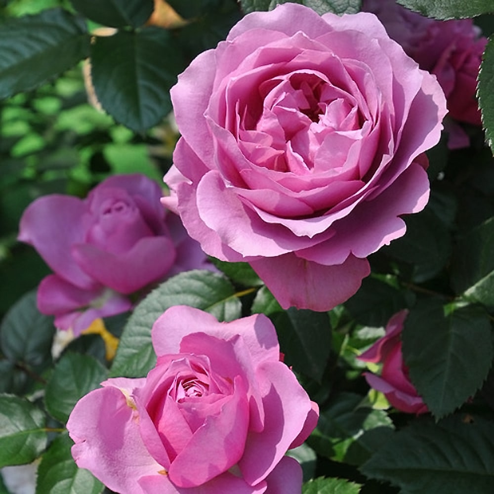 落ち着いたモーブピンクの丸弁咲きから波状弁咲き、中輪房咲きのバラです。華やかな花形にもかかわらず、その落ち着いた花色のためかどことなく寂しげで、アンニュイな雰囲気をまとっています。儚げな見た目の割には、しっかりとした花弁で花もちがとても良いので、切り花としても楽しめます。
