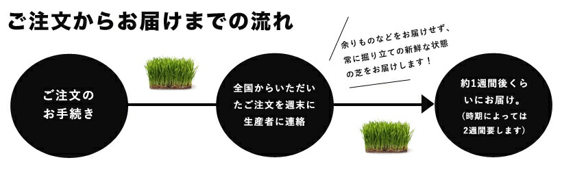 生産販売で毎週の入荷を繰り返しながら、新鮮な状態にてお届けします。雨が降ると芝生がめくれないこともあります。ご注文のタイミングによっては、お届けまで最長3週間ほどお時間をいただく場合がございます。