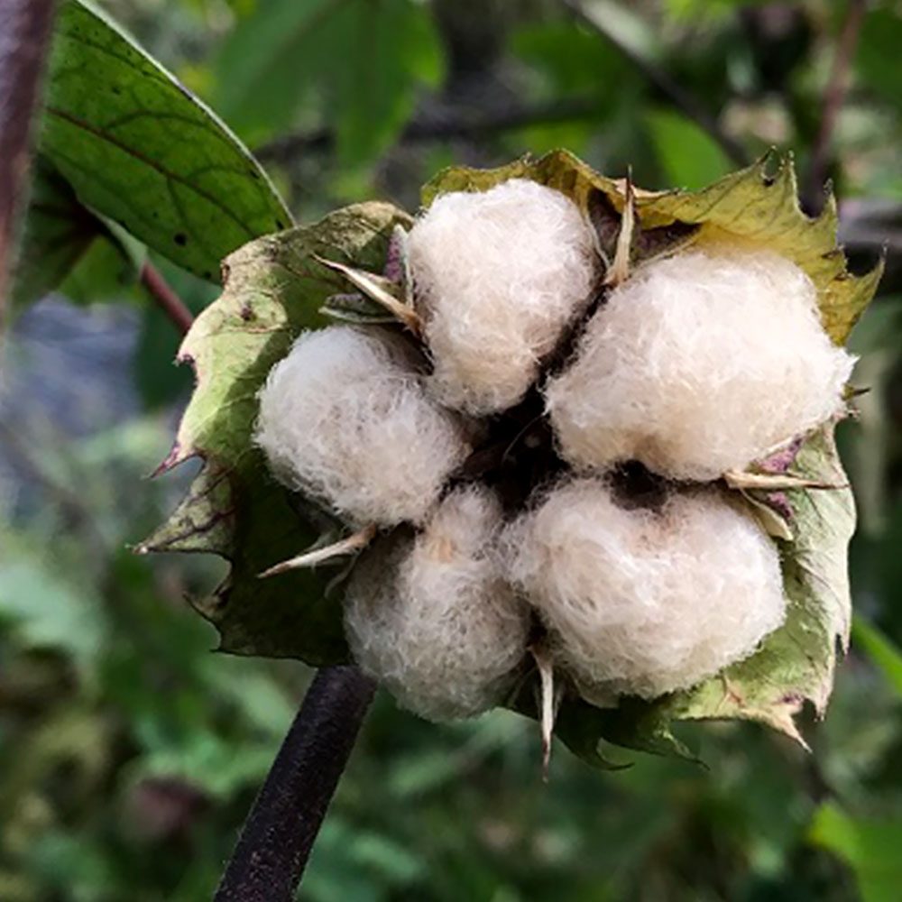 ミルクティーのようなロマンチックな優しいブラウン。淡い茶色が特徴の和綿で、繊維は太く短く、ふとん綿等に適正があります。綿と聞くと、白い色を想像しますが、綿の原種はこのように色がついていました。紫外線から身を守るために色がついていたと言われています。有色綿などの在来種は病害虫や乾燥に強く、栽培に多くの肥料を必要としません。無農薬・無化学肥料での有機栽培に比較的適性があります。