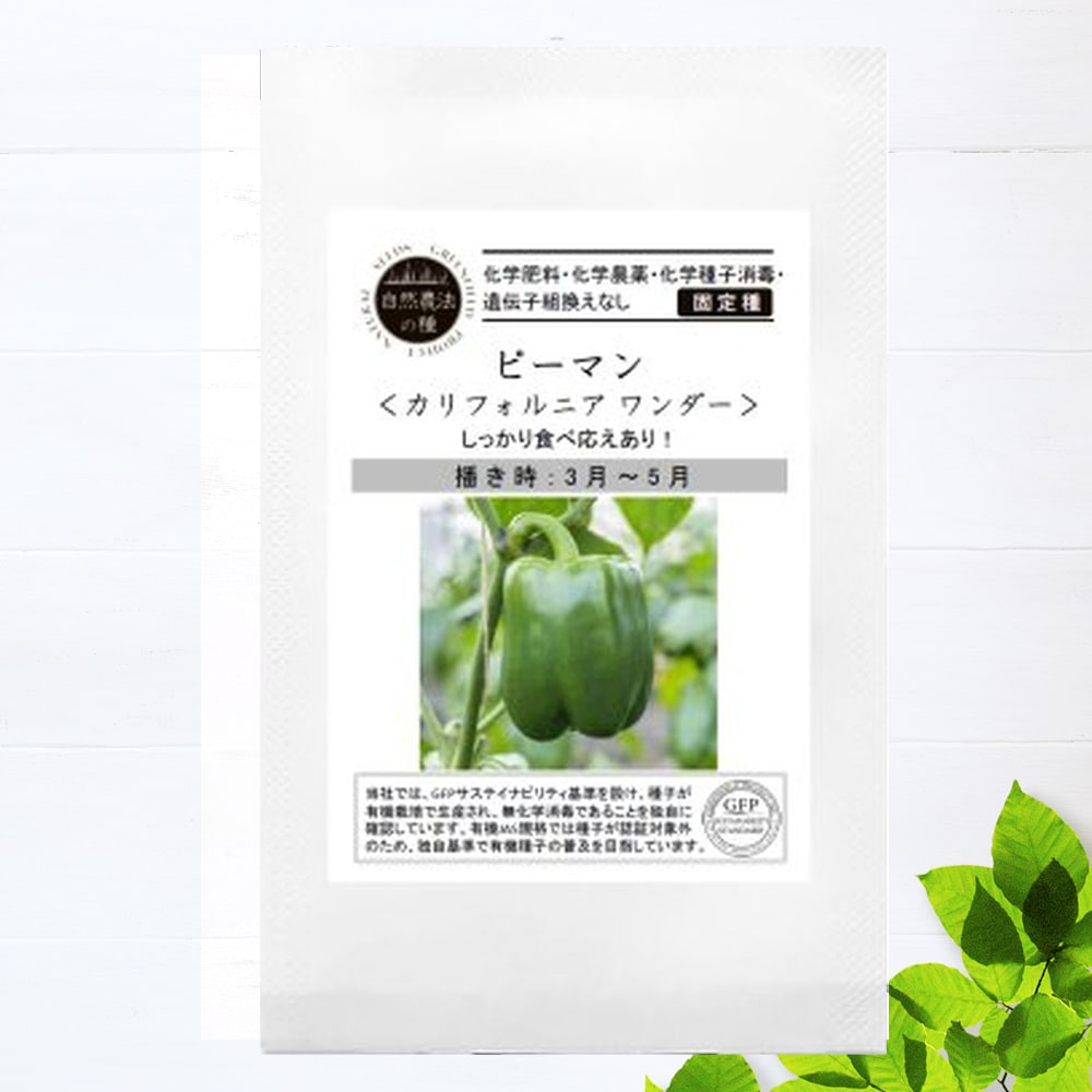 「カリフォルニアワンダー」は、果肉が厚く食べ応えのある大型のピーマンです。肉詰め・天ぷら・炒め物などにあいます。自然農法で栽培された国産の種です。