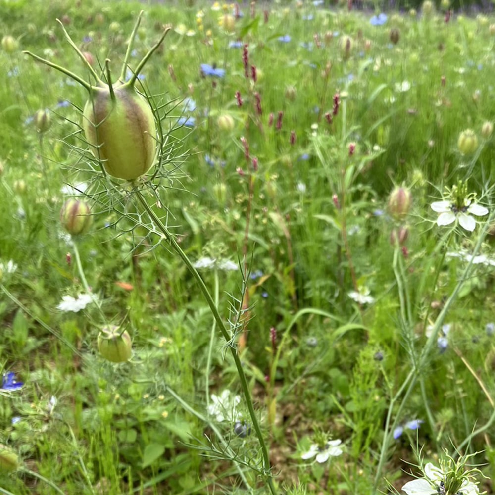「ニゲラ」は黒種草の学名です。その名の通り、花後に結実して黒い種子を付けます。種子にはバニラのような芳香があり、果実が大きくなったころにドライフラワーに仕立てても素敵です。