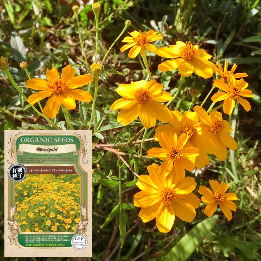 「レモンマリーゴルド」は、標高1400~2500mの山岳地帯に自生するマリーゴールドです。普通のマリーゴールドは一年草ですが、レモンマリゴールドは多年草で冬に落葉しますが、春になれば芽吹いてきます。花付きが非常によく、開花時期の9月~11月にかけて次々と花を咲かせます。葉にはマリーゴールドを濃縮したような強い香りがあり、ハーブティーとして利用されています。レモンの香りはしないようです。