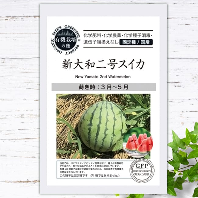 「新大和二号スイカ」は強健なので誰でも簡単に育てられます。皮が薄く果肉は鮮やかな赤色で、甘くて美味しい最高峰の大玉スイカ。1果5~6kgで、寒地から暖地まで幅広い場所での栽培が可能です。昭和初期に育成された固定種で、固定種では唯一の大玉赤肉スイカとされています。