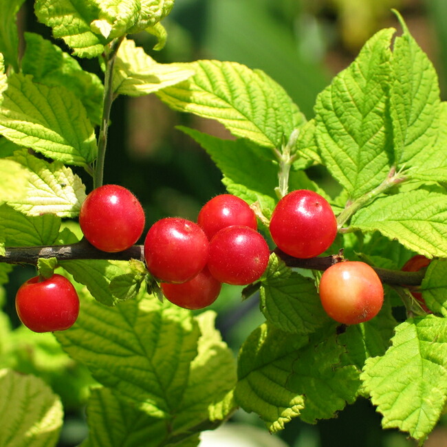 桜梅と書いて、ユスラウメと言います。桜のようなかわいい花と、梅のような甘酸っぱい果実からこの名がついたのでしょうか?果実は薄甘くて酸味が少なく、サクランボに似た味がします。そのままでの生食、あるいは果実酒などに利用してください。サクランボに似た小さな実をつけ、樹は開帳性の1~2mの低木でよく分枝します。果実はほぼ丸いですが、桃の実のように少し縦割れがあり、表面には毛はありません。