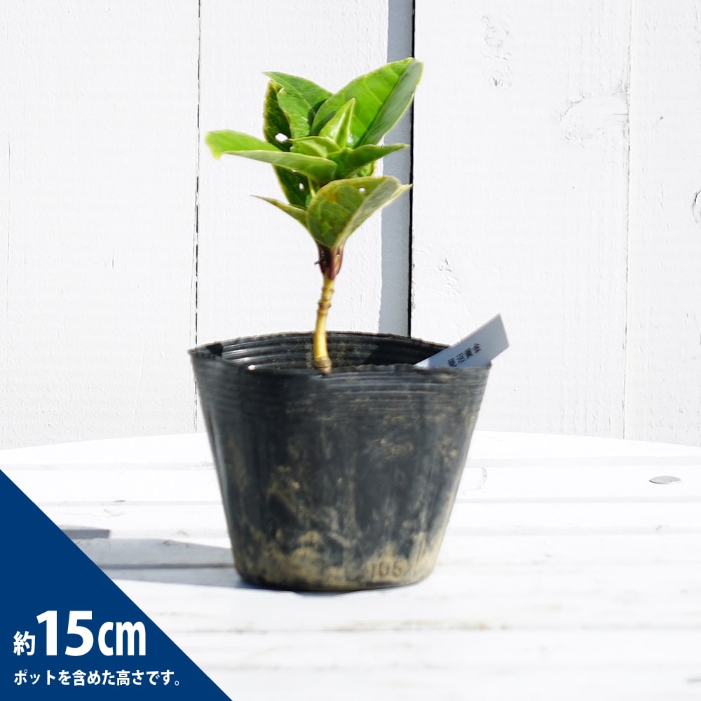 葉が黄金葉になる今までにない独特な品種です。多くのアオキは幹が若いうちは緑色をしていますが、見沼黄金は幹がアメ色をしているアメ幹です。この苗は雄木なので実は付きません。
