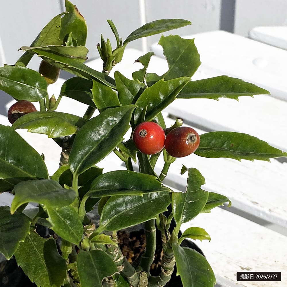 小ぶりの葉が特徴です。他のアオキに比べて特に実付きが良い品種です。