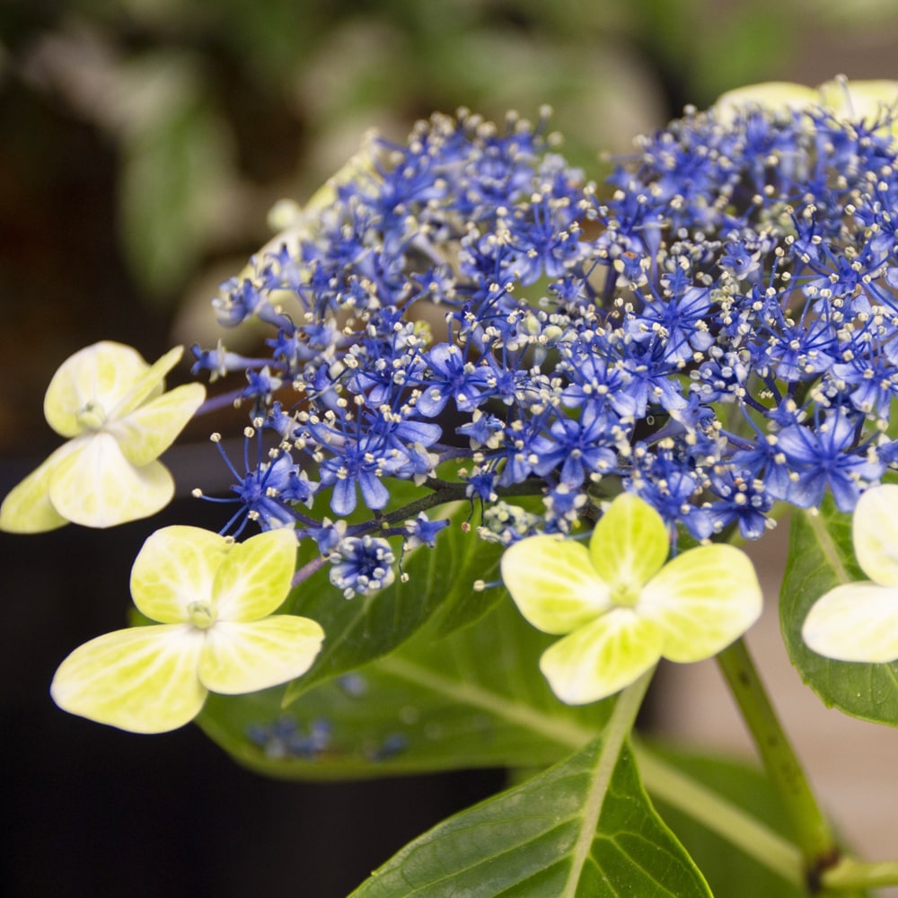 花色が非常に特徴的で、装飾花のガク片は、咲き進むにつれて緑色から中心に白色が入り、さらに筋状の青色が入るとても複雑な色合いになります。両性花は濃紫色のツブツブで、開くと青です。美しい花でとてもよく目立ちます。