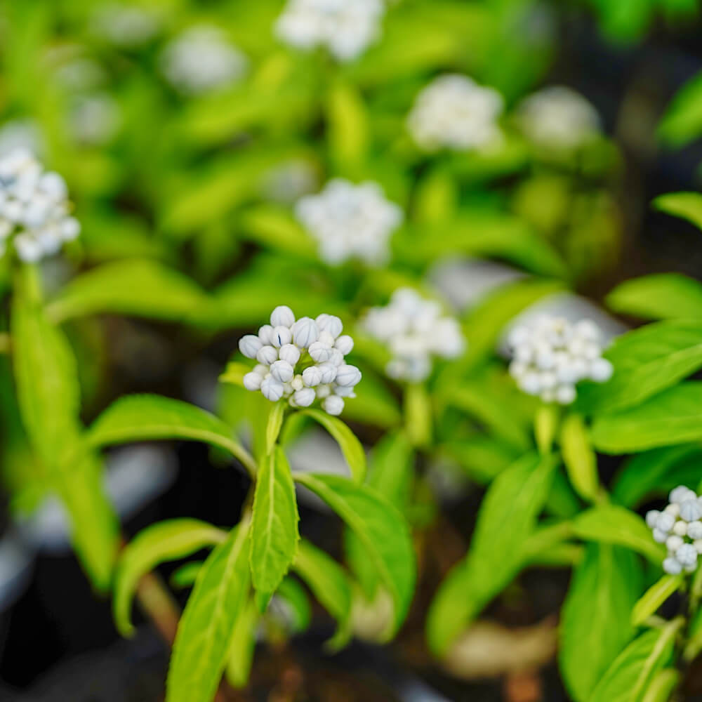 常山アジサイの細葉タイプ。花付きが抜群に良く、6~7月頃に白い蕾から美しい青紫~淡い青色の小花の集合花を咲かせかす。風流な細身の葉と秋に瑠璃色の実が楽しめます。