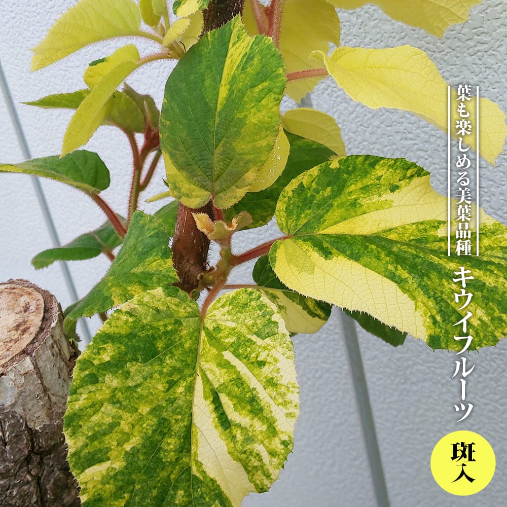 キウイフルーツの斑入り品種。果実としての品種名は不明です。鮮やかな掃込斑が珍しい美葉品種です。受粉樹があれば実をつけます。