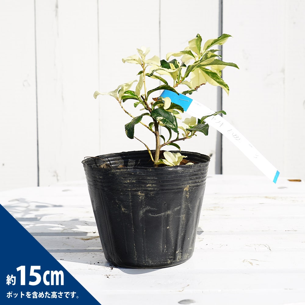 お茶の木白斑は、白掃込斑が入る珍しい品種。美しい葉のお茶の木です。花は白花です。