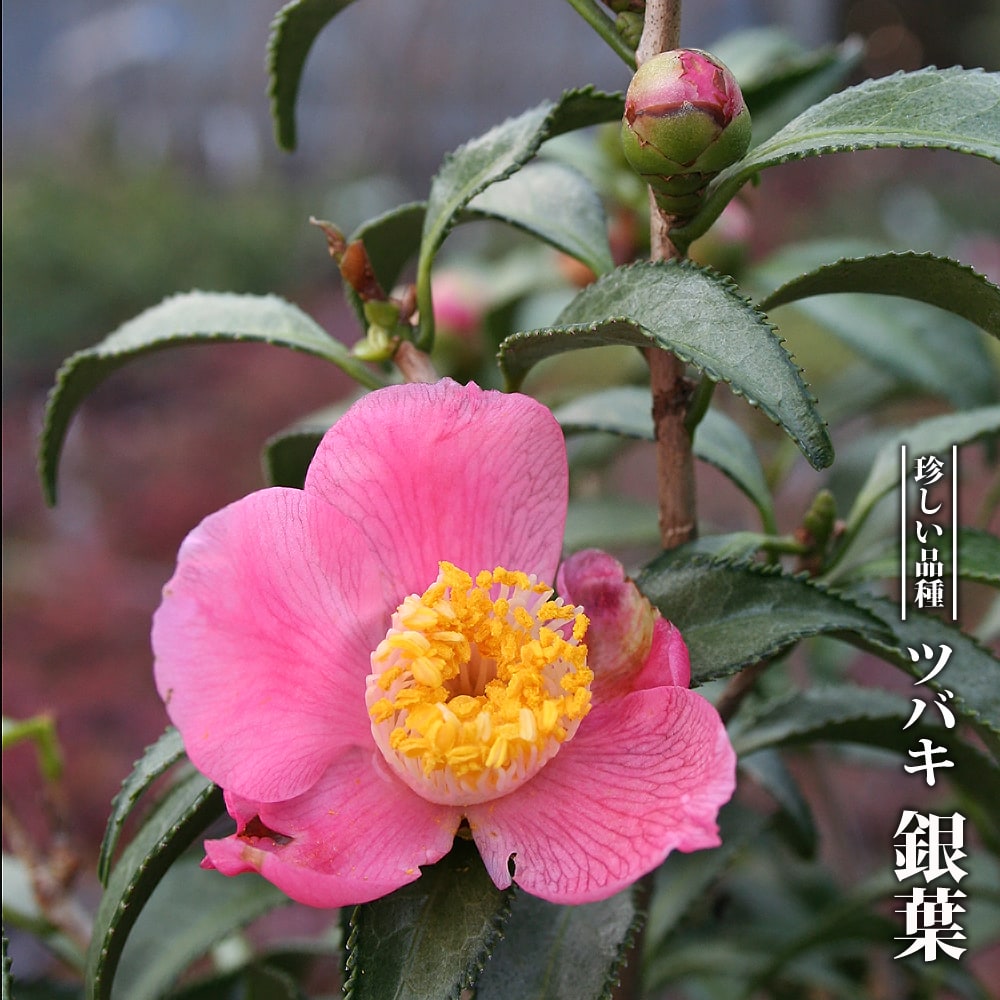 小葉で銀葉に紺フクリン斑(濃い緑の縁取り)が入る落ち着いた雰囲気のツバキです。花は紅花の一重咲きです。