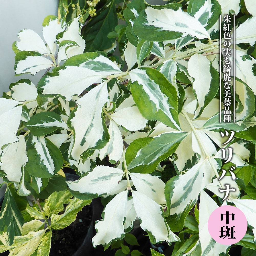 ツリバナ中斑は、葉に白中斑が入る美しい葉のツリバナです。秋には朱紅色の面白い実が付きます。