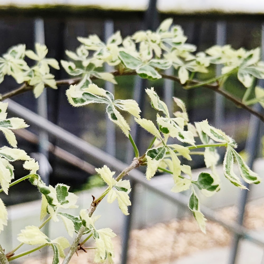 美しい白いフクリン斑が入る珍しいツルウコギです。花や果実はつきません。紅葉もしません。